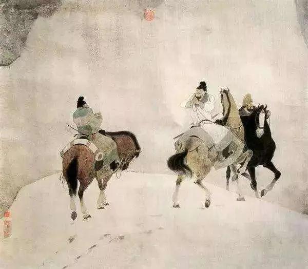 前行复前行,寂寞空伴一骑红尘,泪干了又湿,湿了又干。忽然马儿一声长啸,岑参耳边传来愈来愈响的马蹄声,由远及近。风烟中,另一匹骏马直行而来。他用力睁开酸痛的眸子,立定望着前来的人马,这不是故友吗?“大兄,请留步!”故友也认出了岑参,惊喜过望,马上互相作揖。两位英雄故人,彼此鞍马倥偬,交臂而遇见于塞外戈壁,一个功成名就,作为入京使东归长安述职,一个欲建功立业,西赴塞外,这该是何种缘分?又该说些什么?