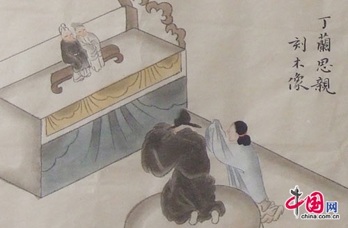 丁兰,相传为东汉时期河内(今河南黄河北)人,幼年父母双亡,他经常思念父母的养育之恩,于是用木头刻成双亲的雕像,事之如生,凡事均和木像商议,每日三餐敬过双亲后自己方才食用,出门前一定禀告,回家后一定面见,从不懈怠。久之,其妻对木像便不太恭敬了,竟好奇地用针刺木像的手指,而木像的手指居然有血流出。丁兰回家见木像眼中垂泪,问知实情,遂将妻子休弃。