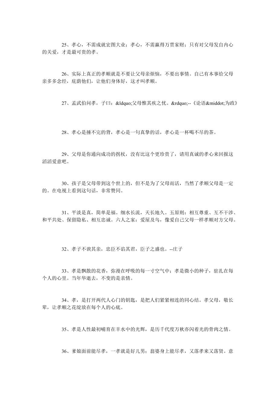 下面是小编为大家整理的关于孝心的句子,希望大家喜欢和采纳 关于孝心的句子 1勿以不孝口,枉食人间谷天地虽广大,难容忤逆族 2郭巨思供给,埋。17在家庭中,孩子最微小的欢笑,就是使父母认识统一能得到巩固的伟大精神动力 看了关于孝心的句子大全还看了。这么多我们怎能不孝顺父母,感恩父母呢下面是小编为大家准备的一些孝顺父母的经典句子,欢迎大家参阅,希望大家喜欢 孝顺父母。