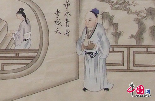 董永,相传为东汉时期千乘(今山东高青县北)人,少年丧母,因避兵乱迁居安陆(今属湖北)。其后父亲亡故,董永卖身至一富家为奴,换取丧葬费用。上工路上,于槐荫下遇一女子,自言无家可归,二人结为夫妇。女子以一月时间织成三百匹锦缎,为董永抵债赎身,返家途中,行至槐荫,女子告诉董永:自己是天帝之女,奉命帮助董永还债。言毕凌空而去。因此,槐荫改名为孝感。