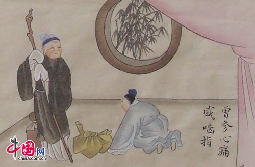 曾参,字子舆,春秋时期鲁国人,孔子的得意弟子,世称“曾子”,以孝著称。少年时家贫,常入山打柴。一天,家里来了客人,母亲不知所措,就用牙咬自己的手指。曾参忽然觉得心疼,知道母亲在呼唤自己,便背着柴迅速返回家中,跪问缘故。母亲说:“有客人忽然到来,我咬手指盼你回来。”曾参于是接见客人,以礼相待。曾参学识渊博,曾提出“吾日三省吾身”(《论语·学而》)的修养方法,相传他著述有《大学》、《孝经》等儒家经典,后世儒家尊他为“宗圣”。