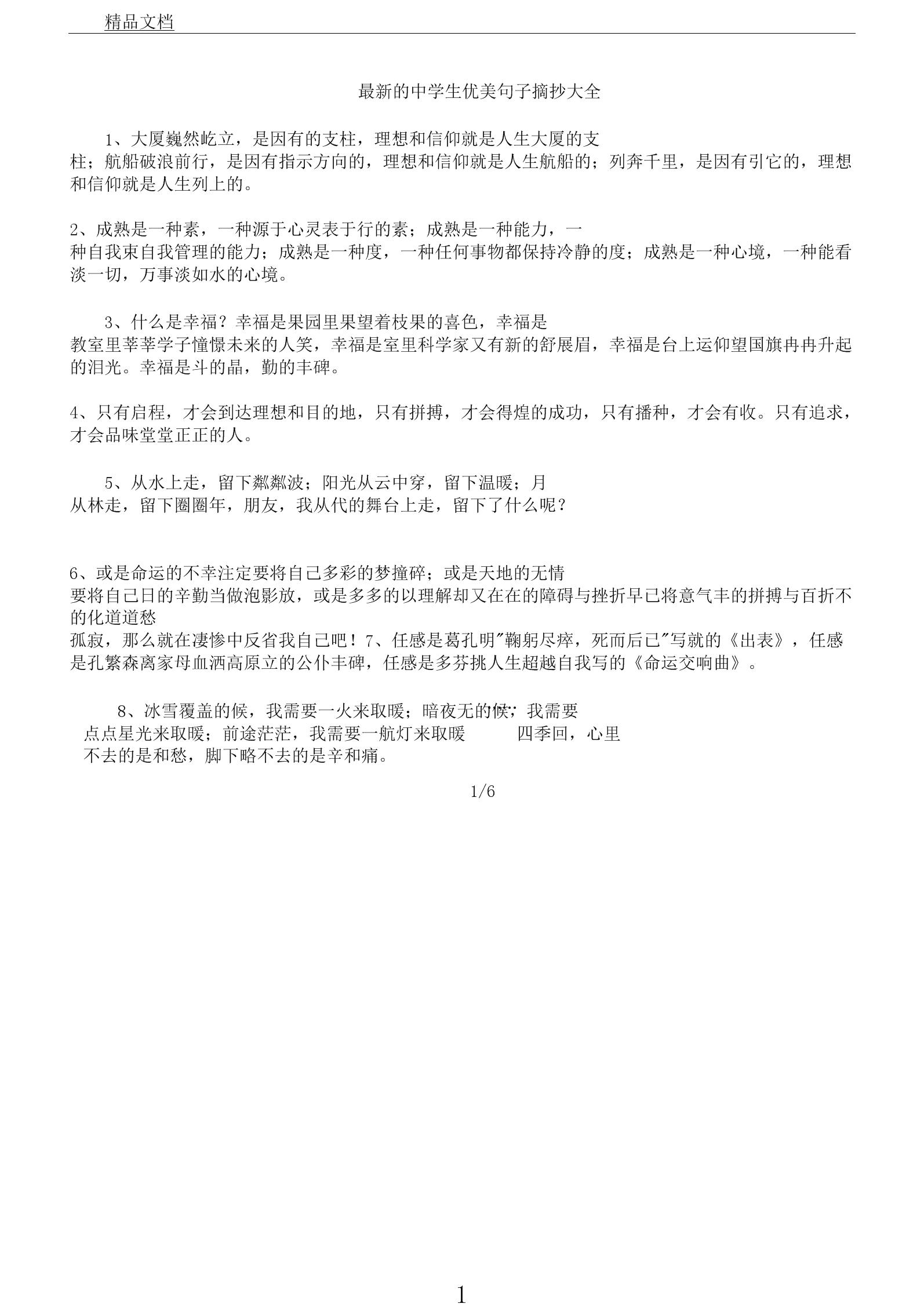 十人生最重要的目的,是要通过努力和奋斗来发展自己发展自己的人往往立足于自己的事业,建立对自己适合的目标他们在充实和提高自己的同时,享受自己奋斗的。初中生好句好段摘抄大全 1记不清有多少个夜晚,在我翻阅纸张的指间滑落记不清有多少支蜡烛,在我的凝视中化为灰烬逝者如斯,我时时刻刻会听见自己对生命承诺的余音,感到岁月的流转。