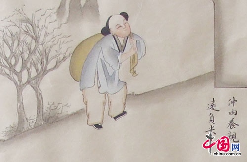 仲由,字子路、季路,春秋时期鲁国人,孔子的得意弟子,性格直率勇敢,十分孝顺。早年家中贫穷,自己常常采野菜做饭食,却从百里之外负米回家侍奉双亲。父母死后,他做了大官,奉命到楚国去,随从的车马有百乘之众,所积的粮食有万钟之多。坐在垒叠的锦褥上,吃着丰盛的筵席,他常常怀念双亲,慨叹说:“即使我想吃野菜,为父母亲去负米,哪里能够再得呢?”孔子赞扬说:“你侍奉父母,可以说是生时尽力,死后思念哪!”(《孔子家语·致思》)