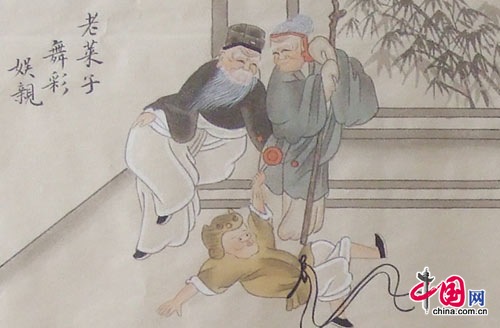 老莱子,春秋时期楚国隐士,为躲避世乱,自耕于蒙山南麓。他孝顺父母,尽拣美味供奉双亲,70岁尚不言老,常穿着五色彩衣,手持拨浪鼓如小孩子般戏耍,以博父母开怀。一次为双亲送水,进屋时跌了一跤,他怕父母伤心,索性躺在地上学小孩子哭,二老大笑。