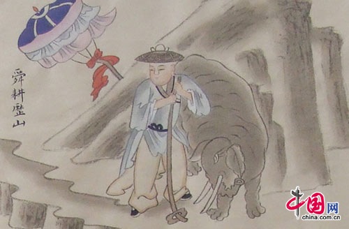 舜,传说中的远古帝王,五帝之一,姓姚,名重华,号有虞氏,史称虞舜。相传他的父亲瞽叟及继母、异母弟象,多次想害死他:让舜修补谷仓仓顶时,从谷仓下纵火,舜手持两个斗笠跳下逃脱;让舜掘井时,瞽叟与象却下土填井,舜掘地道逃脱。事后舜毫不嫉恨,仍对父亲恭顺,对弟弟慈爱。他的孝行感动了天帝。舜在厉山耕种,大象替他耕地,鸟代他锄草。帝尧听说舜非常孝顺,有处理政事的才干,把两个女儿娥皇和女英嫁给他;经过多年观察和考验,选定舜做他的继承人。舜登天子位后,去看望父亲,仍然恭恭敬敬,并封象为诸侯。