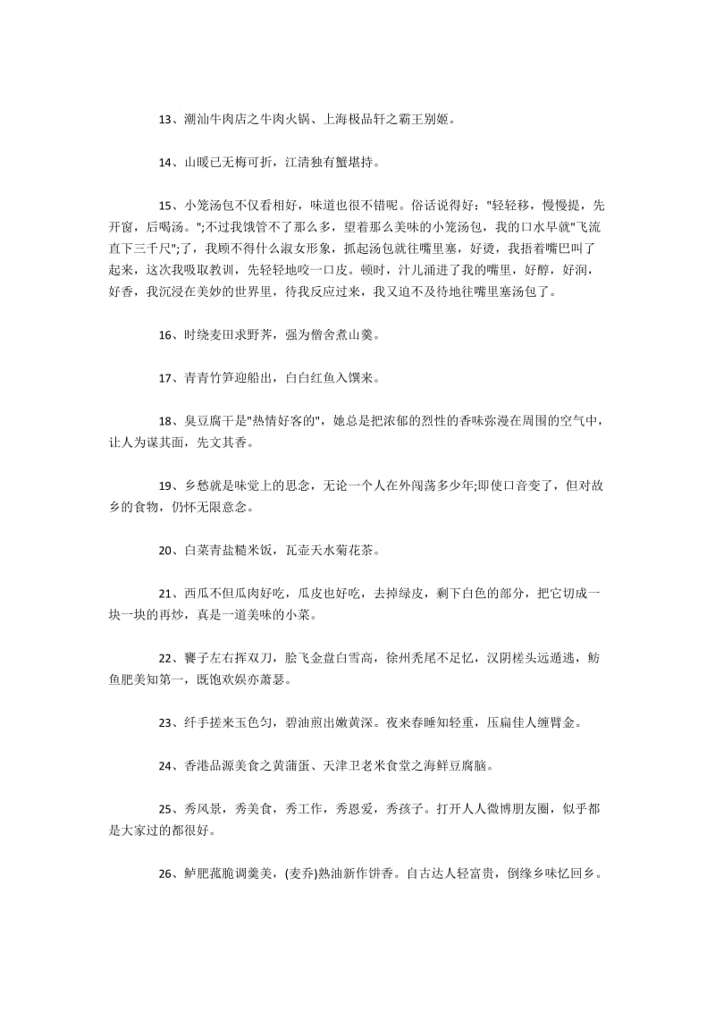 句子栏目在这里给大家整理了有关人间美味的句子30字2021人间美味的句子30字人间美味的句子30字赏析等,祝大家阅读愉快。漫话红烧肉描写红烧肉的句子 第1句中国的饮食文化源远流长,其中有一道脍炙人口的美食深受广大人民群众的喜爱红烧肉红烧肉外观体现出“浓油赤酱”的。形容美食诱人的句子的实用资料专题为大家提供形容美食诱人的句子的实用资料相关内容的文章,以帮助大家更快的找到所需内容希望丰富的形容美食诱人的句子资讯。