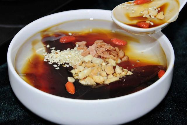 传统冰粉的做法颇费功夫,现今有了加工好的小袋冰粉卖,将鲜开水按比例把冰粉加入搅拌均匀,冷却后放入冰箱两小时后就可以吃了!还可熬制烂茸茸的绿豆汤充调冰粉,不仅颜色绿幽幽的,清香可口,也更加清热、去火、解暑、利尿、祛风、消炎等功效,治发烧、风湿性关节炎、疮痈肿痛等症。如若加上煮熟的银耳,再撒点果仁碎之类的,那身价和品味就更加不一样了哈。只是传统冰粉是加的红糖水,亦可直接用蜂蜜,那又是风味别样。
