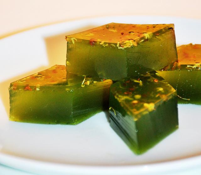 小吃大师舒国重制作的水晶桂花凉糕,体态优雅、色泽幽绿,清凉滑腻,十分可口。《四川省志•川菜志》编委会副主编 川菜文化人 川菜撰稿人