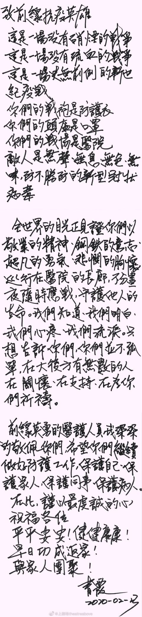 林青霞的亲笔信这封信写得很好,很有气势,歌颂了这场伟大的抗疫战争,每每读起来都有一种激情澎湃、斗志昂扬的感觉;同时这封信也让前线的医护人员知道,在大后方,有许许多多的人都在关心着、在支持着他们,在为着他们祈祷,希望他们最后功成返家,和家人团聚。我想前线的医护人员看到这封信后一定会很高兴的。