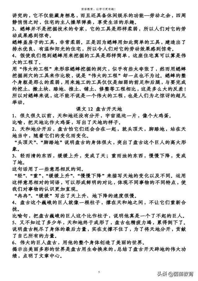揭示出美丽多彩的世界是盘古用生命换来的,总结了盘古开天辟地的伟大功绩,点明了文章中心。