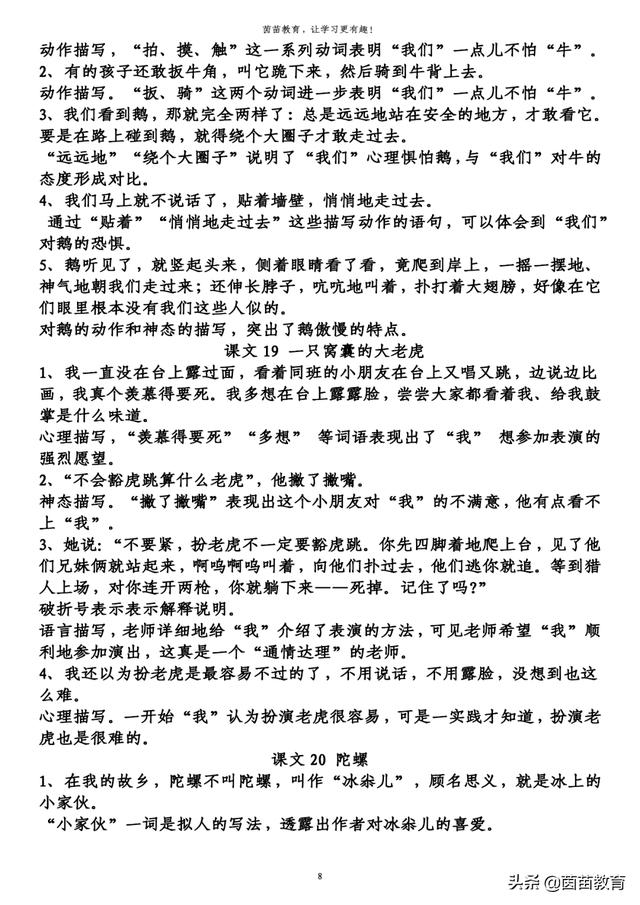 3、她说:“不要紧,扮老虎不一定要豁虎跳。你先四脚着地爬上台,见了他们兄妹俩就站起来,啊呜啊呜叫着,向他们扑过去,他们逃你就追。等到猎人上场,对你连开两枪,你就躺下来——死掉。记住了吗?”