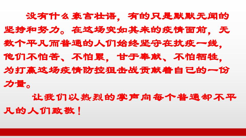 致敬抗疫英雄一段话 小学生致敬抗疫英雄的话语,面对新型冠状病毒,全国人民万众一心,与病毒展开了一场前所未有的殊死搏斗,涌现了一大批可歌可泣的英雄事迹,小学生们为了向最可爱的人。清明节到了,对于那些抗疫英雄,你有什么话想说呢?以下是小编整理了关于2020清明节缅怀抗疫英雄的句子_抗疫英雄我想对你说,希望你喜欢 清明节缅怀抗疫英雄的句子。致敬,奋战在一线的公安姐妹们! 以上就是高考网小编为大家介绍的关于致敬抗疫英雄一段话 有哪些优美句子问题,想要了解的更多关于致敬抗疫英雄一段话 有哪些优。