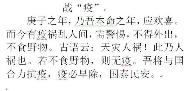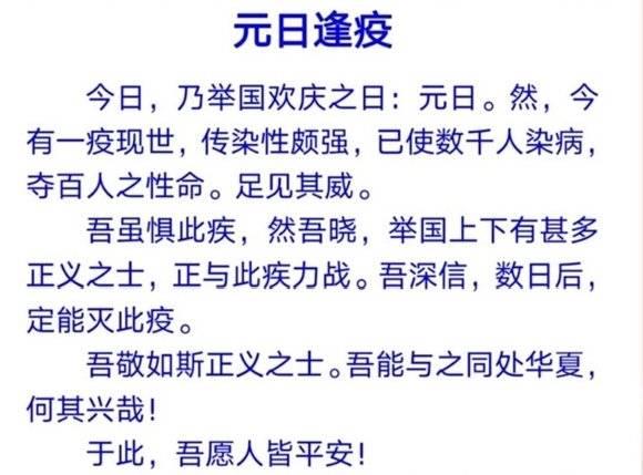 据记者了解,这些文言文是济南景山小学六(2)班的同学们写的 ,该班的学生一直有坚持小古文学习与创作的传统,假期也布置了相应的古文创作作业。疫情来临,在老师的指导下,他们及时调整创作主题,为这场没有硝烟的战争助力,用手中的笔表达着小小少年对国泰民安的祈盼。“万心同力,共抗疫情,惟愿,疫早去,国泰民安。”一名小学生在文中写道。