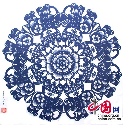 (八方来福 此团花剪纸外圈为大象,寓意万象更新,内圈8只蝙蝠,因蝠谐音福,所以寓意八方来福。)