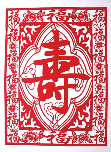 “寿”字是最受人喜爱的汉字之一。看似普通的一个“寿”字,却蕴涵着人们对于生命的热爱,对于吉祥的追寻。经过数千年历史文化的洗炼,它所蕴含的丰富意境,几乎为每一个中国人所认知。寿字也逐渐被图案化、艺术化,成了一个吉祥的符号。祝寿图中以“寿”字构图的,被称为寿字纹。既有多字构图的,也有单字构图的,字形圆的称圆寿或团寿,以及花寿,字形长的称长寿。“团寿”的线条环绕不断,寓意生命绵延不断;“长寿”则是借助寿字长条的形式表示生命的长久。而花寿是寿字与图案的组合搭配,以寿字为主题体,辅以各种具有吉祥意义的人物、花卉等。现如今,多将寿字纹用作服饰图案,过年时穿上印有寿字纹的衣服,马上就洋溢出喜庆吉祥的气氛。