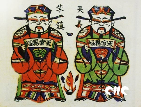 中国民间多认为三官中的天官是福神。道教中的三官是指天官、地官和水官,道教中有天官赐福、地官赦罪、水官解厄的说法。中国民间天官赐福信仰很普遍,人们敬奉天官,祈求天官赐福。所以“天官赐福”的吉祥图或年画也很常见。图上画着慈祥和气的天官抱着如意,五个童子各捧吉祥物围绕在他身旁,或者天官抱着五个童子,童子手中分别捧着石榴、仙桃、佛手、梅花和吉庆花灯。图画寓意福星高照、吉祥富贵。也有把天官画成身穿大红袍的一品官员,手中拿着展开的“天官赐福”诰命,上面有蝙蝠从天飞来,意指上天降福人间。