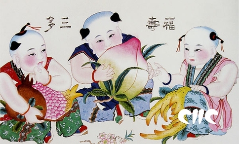 “三多”指多福、多寿、多子。多福、多寿、多子很长时间以来都是中国人的美好追求和理想。这种愿望通过形象的实物得以表达。中国民间的《三多图》大多由佛手、桃子和石榴三种果实组合而成。佛手的“佛”意味着神佛,又与“福”谐音,有幸福的寓意。民间也传佛的手能握财宝,有财宝表示有福,所以佛手成为祈福纳吉的吉祥物。挑子代表多寿,传说王母娘娘有蟠桃,吃了可以长生不老,中国民间常以桃来祝寿。石榴是多子的果实,象征着多子多孙,人丁兴旺。年画中的《福寿三多》画着三个活泼可爱的儿童各抱着或举着一种鲜果:佛手、桃子、石榴,表达了人们对理想美好生活的追求。