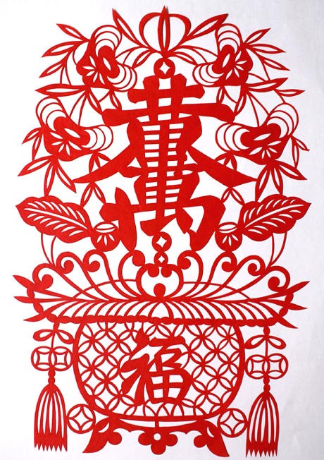 (用一个造字内含黄金万两4个字,边上配以金元宝和钱币,象征祈富。)