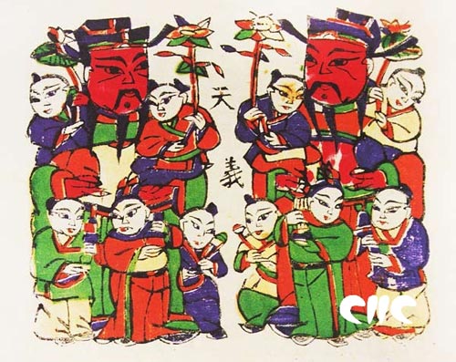“五子登科”的吉祥图案是我国民间特有的民间风俗和吉祥物。它起源于一个古老的传说:一位叫窦禹钧的人横行乡里,为非作歹,但他听从梦中祖父的劝告,痛改前非,有了好名声,于是他得到了五个儿子。他严于教子,最后五个儿子都品学兼优,很有出息。“五子登科”图表达了人们期望子弟能取得像窦家子弟那样的成就的愿望。常见的“五子登科”图一种是站在巢上的威武大公鸡叫唤巢边的五只小鸡,因“叫子登第”与“教子登第”谐音,公鸡的鸡冠寓意“加官”。另一种是四个儿童围着一个大儿童抢他手中的头盔,因“盔”与“魁”谐音,故称“五子夺魁”,寓意子弟在考试中名列魁首。