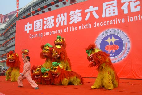 第六届涿州花灯节上表演的舞狮子 (韩琳摄)耍狮子:
