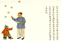 进得门来,第一进院落中有三座石桥,但桥下无水。三座桥只开中间一个桥洞,洞中朝东西方向平分开,两侧各设一方桌,桌上有两位道士分东西盘腿打坐——从早开山门起,一直坐到傍晚游客散尽他们才能如释重负地回堂休息。“溜溜”一天,也真够辛苦的了。他们是白云观的主要节目,也是过年庙会的主要财源之一“打金钱眼”的一对“活道具”。他们所坐的桥洞上端,东西各高悬一直径约为两尺、厚为三寸余的纸胎,上面糊以金纸的大金钱。金钱是用红绒绳从南北两端绷紧的,中孔内系一小铜铃。在东西两侧桥畔,设有许多以现钞兑换已不流通的制钱摊子(多为本观道士经营),以一角钱兑换十个制钱。游客们即于两侧桥面上瞄准相距五米开外的金钱孔上的小铜铃投掷。谁能打得准,把铜铃打中打响,这一年他就会顺顺当当儿,事事如意。这就是著名的“打金钱眼”。因距离较远,铜铃又小,能打中者,纯系偶然。不过人总是要试试“运气”,即使花多少钱去兑换制钱也在所不惜。