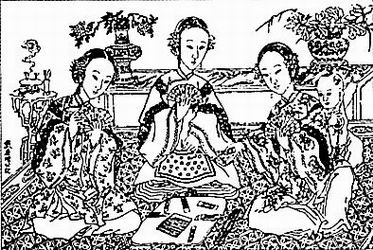 守岁:除夕之夜,合家点灯熬夜,辞旧岁,迎新年,俗称守岁。守岁有许多活动,如吃饭、做游戏等。图为古代女性玩牌守岁。