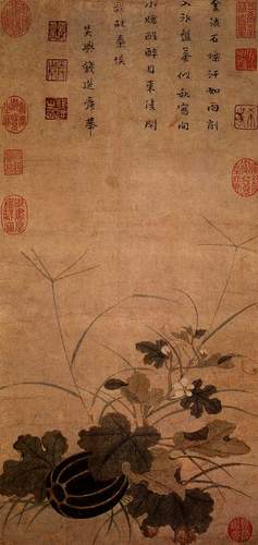 秋瓜图 纸本、设色,纵63.1厘米,横30厘米,是钱选花卉蔬果中的代表作品。此图精致典雅,与宋代小品画一脉相承,然而又透出一股书卷气,即所谓精工之极富有士气,精致而不艳丽,细腻而不纤巧,作者在追求一种清润淡雅的画格。画家在图中题诗一首:“金流石烁汗如雨,削入冰盘气似秋。写向小窗醒醉目,东陵闲说故秦侯。”表达了一个不肯屈节仕元的汉族士大夫的志节和操守。钱选的作品中,大多有自己的题诗和跋语,他运用笔墨表达自己的主观情绪,又结合诗意来充实画意,黄公望说“知其诗者乃知其画”。这种诗、书、画三者结合的形式,被后来的文人画家广泛使用,形成中国绘画的传统特色。从这个意义上说,钱选在开创有元一代的画风上,是起了先驱作用的。在技法上,其折枝瓜果画法在写生基础上更经过了艺术提炼,删繁就简,突出了画面的意境情趣。这个转变,除与钱选本人“天机”有关,也与元初花鸟画渐变简逸的时代风尚密不可分。