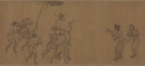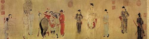 杨贵妃上马图 卷轴、纸本、设色,纵29.5厘米,横117厘米。美国弗利尔美术馆藏。此卷绘唐玄宗与贵妃杨玉环上马的情形。玄宗骑照夜白,侧面望着贵妃,贵妃旁有两侍女协助。图中共绘十四人,皆着唐装,人物身形饱满,姿态、动作各不相同,形象刻画细微、生动。衣纹线描工整,连绵转折,顿挫有力,皆为游丝描。敷色虽艳丽而又雅洁清润,画人物不着背景,也是受唐代绘画的影响所致。在人物服饰、构图特点、设色及取材等方面皆体现了元初绘画的复古之风。