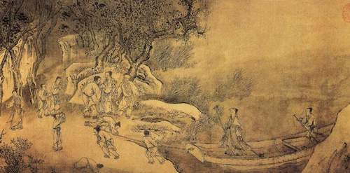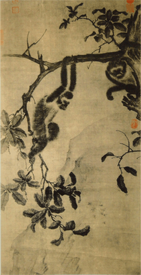 百猿图 绢本、设色,纵131.8厘米,横67厘米,台北故宫博物院藏。颜辉曾作《百猿图》,戴良在题记中曾道破其“图猿之为状凡百数”的创作目的:“猿之为猴其形相近也,其举动相若也。然猿之性类乎仁,遇稼穑不践踏,见小草木必环之以行,木实未熟则守之。猴之为性恒反是,反是则几于暴矣”。作者赞扬猿是“不伤禾稼”的“仁者”,正是要暗暗谴责将良田辟为牧场,并横征暴敛的元初统治者。
