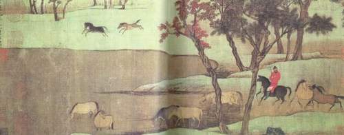 秋郊饮马图 绢本、设色,纵26.4厘米,横100厘米,现藏北京故宫博物院。此为赵孟頫鞍马人物画的代表作。画面是江南初秋时节,牧人赶着一群马到河岸边饮水的情景。画中岸边林木环绕,湖水平缓无波,牧马人身着红袍,手持马鞭,正侧首看着正在嬉戏的二马。10匹马都健壮肥硕,有的步入河中饮水,有的在岸边追逐,有的互相嬉戏,有的引颈长鸣,神态各异。整个画面树木清秀,河水平缓无波,马的造型生动,表现了自然景致的优美此图布局讲究藏露,中景露地不露天,人马、坡石、林木都置于右半部,人马向左方走,把来处藏于画外。左方只露出树干和溪水,把树干和远山、远水藏于画外。堤岸、溪水向左方延伸,通过岸上两马的奔逐,点出境外无限的景物。构图均衡有致,物象虽具体而微,整体却极简括。