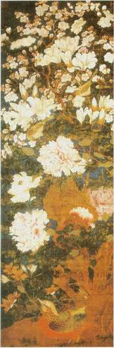 玉堂富贵图 绢本,纵112.5厘米,横38.3厘米,现藏台北故宫博物院。图中以玉兰、海棠、牡丹三种花相配,取玉兰的“玉”和海棠的“棠”谐音构成“玉堂二字,牡丹本是花中之王,被称为“富贵花”,由此组成“玉堂富贵”的画题。在构图技法上,此图独特别致而意蕴无穷。三花之中的牡丹与玉兰、海棠所占画幅相等,牡丹共五朵,从含苞待放到怒放有五种不同形态,画家把它画在视觉中心点上,形成放射状,内涵是显而易见的。画中牡丹、玉兰、海棠花和枝布满全幅,花枝花朵挤出画面边线,满纸点染,整个画面不留空隙,使人感觉到充满生命力的花朵的扩张力。图的下方,湖石边绘了一只羽毛华丽的野禽,野禽的眼特别醒目,形成以此眼点展开的扇面,扩大了有限的空间,使画面具有张力,造成一种繁花似锦,满堂生辉之感,呈现出一派生机。技法上先用墨笔勾出枝叶与花鸟轮廓,然后再敷以色彩。玉兰、牡丹、海棠,白的淡雅,粉的娇媚,在石青铺地儿的映衬下,更现端庄秀丽之气韵。徐熙喜用水墨淡彩作画,他的画给人以超逸清雅之感,这大概与他的出身经历和“淡泊宁静”性格有关。
