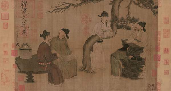 此图《宣和画谱》亦有著录。《勤斋集》所记较为详细:“图凡八人,皆唐衣冠,三僮子前,三人与胡僧对坐,朱衣者持梵夹读,僧屈指为数物状;衣绿者指左,黄衣者拱手,皆有谈说,似是为文事者。中二人偕立,童子磨墨,一则凭曲松而言,若口授其意;一则据石,左执卷,右秉笔而掌其颐,若思概括其意而将之书者。后二人坐石上,共执卷,一读而指其文,一仰而若有所思者”将此记与现藏此卷人物对照,正与此吻合,画面着色淡雅,格调清逸,衣纹线描顿挫转折而有颤动之感,与今传《重屏会棋图》用笔一致。周文矩画风上承晚唐周昉,设色简单,又受李后主书法“金错刀”影响。画中靠背椅、榻、书箱等,据考古及文献记载,都证明系五代后才有,皆排除了作者是韩滉的说法。清末民初,此本为狄平子所得,卷首有其长跋,后流往国外。