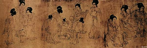 宫中图 此画据说为周文矩真迹的南宋摹本。此卷共有三段,为南宋摹本。1947年左右流出海外。第一段28.3厘米×168.5厘米,藏克里夫兰美术馆,曾名《仕女图》;第二段名《宫中图》,藏哈佛大学福格博物馆;第三段名《唐宫春晓图》,原为英国私人藏,现藏大都会美术馆。藏克里夫兰美术馆《宫中图》本,卷后有南宋淡岩居士张激绍兴十年(1140年)跋:“周文矩《宫中图》,妇人小儿,其数八十一男子写神”。明代张丑《真迹目录》、清卞永誉《式古堂书画汇考》、现代郑振铎《韫辉斋藏唐宋以来名画集》等均有著录。