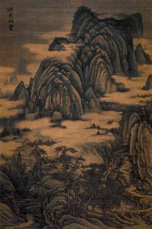 图中白云吞吐飘浮于山间,深沟巨壑中山道弯弯,涧流清澈。山林白云深处,林木摇曳,阁楼峥嵘,造景幽深雅静,鲜明地表现了世外仙境。画幅右上楷书“洞天山堂” 四宇,点明了全画主题。此图用笔坚实,用墨浓重,山石以长皴短点相间,再复加染以浓重墨色,显出一种浑雄苍郁的气派。此画无款,诗堂有清人王铎跋语:“神理气韵,古秀灵通,入于口微,董源此图,当属玄化,丙戌端阳后二日题于琅华馆。”故此遂被定为董源手笔。然此图笔墨苍劲,景色茂密,云朵以白粉染绘,与董源之淡墨轻岚颇不相类,更近于金元以后山水画风貌。另外从全画布置创意看,所画景山物范围已比北宋全景山水缩小,近于李唐《万壑松风图》的体制,其时代应相当于南宋。但图中所画宫室的特点又非南宋而近于金元,故此图更可能是金代作品。金代很多山水画承袭董、巨而有所变化,故拟此画为金代之作似更为恰当。王铎题为董源之作,不知何据。