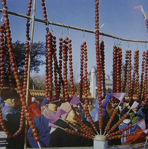 糖葫芦只有在北方的庙会上才有得卖。有的糖葫芦甚至有几米长。