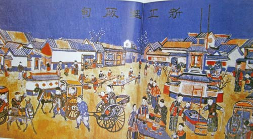 上图的年画大约是一个世纪以前制作的,画中表现的是厂甸庙会的景象。
