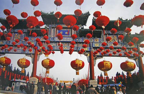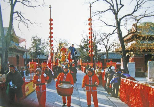 东岳庙,位于北京东部的朝阳门外大街上,始建于14世纪上半叶,是祭扫东岳泰山之神的地方。近年来东岳庙得到修缮,开始重新举办已停止50年之久的春节庙会。(图片来源:外文出版社《中国庙会》)