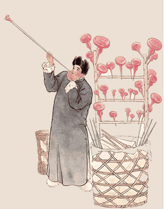 卖糖人的手艺人将糖稀慢慢倾倒在石板上,勾画出各式各样的图案,然后附上小竹棍,凝住,小孩子们边吃边玩,是过去庙会不可缺少的风景。