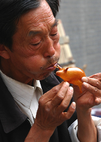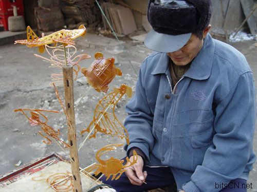 庙会上吹糖人的吹糖人是把糖料吹制成各种造型。据说吹糖人技艺始于明末清初,制作时把糖稀熬好,用一根麦秸杆挑上一点糖稀,在对这麦秸杆吹气,糖稀随即像气球一样鼓起,在通过捏、转等手法配合吹起塑成各种造型。最后用竹签跳下,冷却后成型。吹糖人以动物造型居多,体态丰满,常见的是以十二生肖为内容。吹出的糖人质地很薄,易碎。