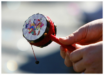 拨浪鼓是我国最传统、最古老的玩具之一。直到现在,我们每年在逛庙会的时候依旧可以看到许多卖拨浪鼓的摊子,虽说挑担子的货郎是难以见到了,但是“嘭-嘭-嘭嘭嘭” ……那熟悉的鼓声却时常能在我们耳边响起。