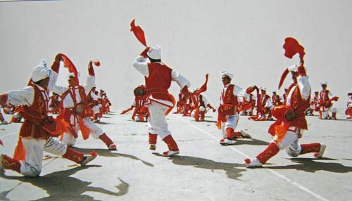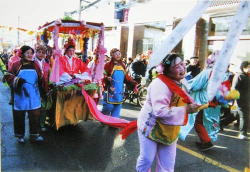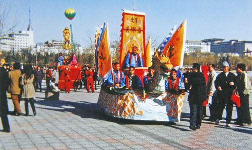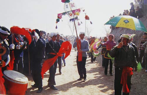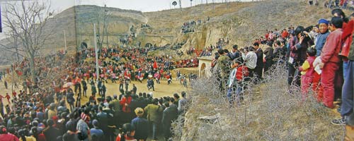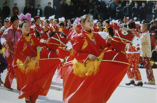 村镇民俗艺术演出的表演人员都是当地村民,他们会组成几十人、最高达到两百人的舞蹈队。村民们有的跳秧歌,有的表演腰鼓,还有的踩高跷……上图是陕西北部的一支秧歌队。(图片来源:外文出版社《中国庙会》)