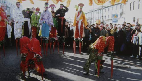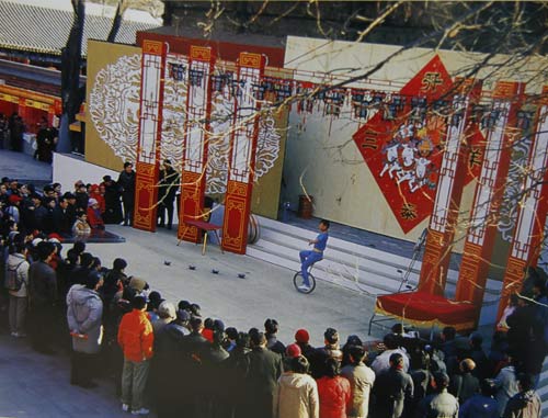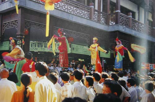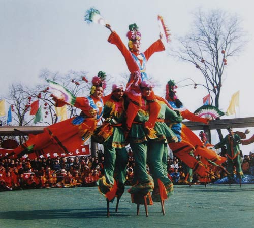在上海城隍庙庙会上,杂技演员脚踩一米多高的高跷进行表演,这样观众即使隔得很远也能够看到。(图片来源:外文出版社《中国庙会》)