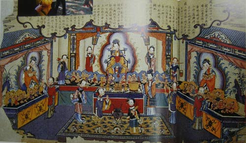 ? 这幅绘于清朝的天津杨柳青年画形象地描绘出当时的年轻少妇们到庙里求子的景象。