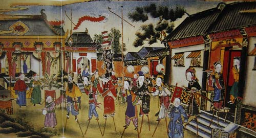这张大约一个世纪之前制作的年画表现的是庙会中的高跷表演。